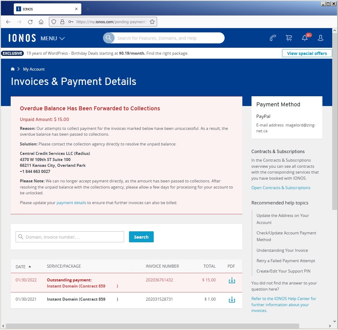 Then the rep argued with me that they send out SEVERAL renewal notices before it expires. (This is actually a LIE. See below.) Contacted support again by email and told them to cancel the domain and I'm not paying for it. The rep told me I was too late and I only had 72 hours from the day of expiry to cancel the domain and if I don't pay it, they'd send it to a "collection agency".